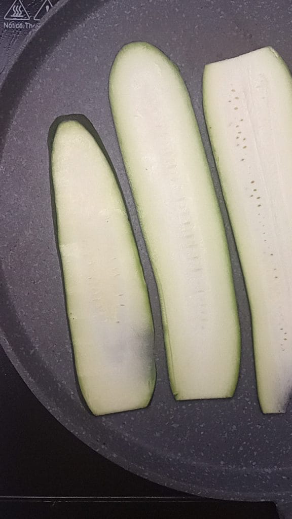Calentamos una plancha por unos instantes y colocamos las rodajas de calabacín, pocas a la vez, para manejarlas durante la cocción.