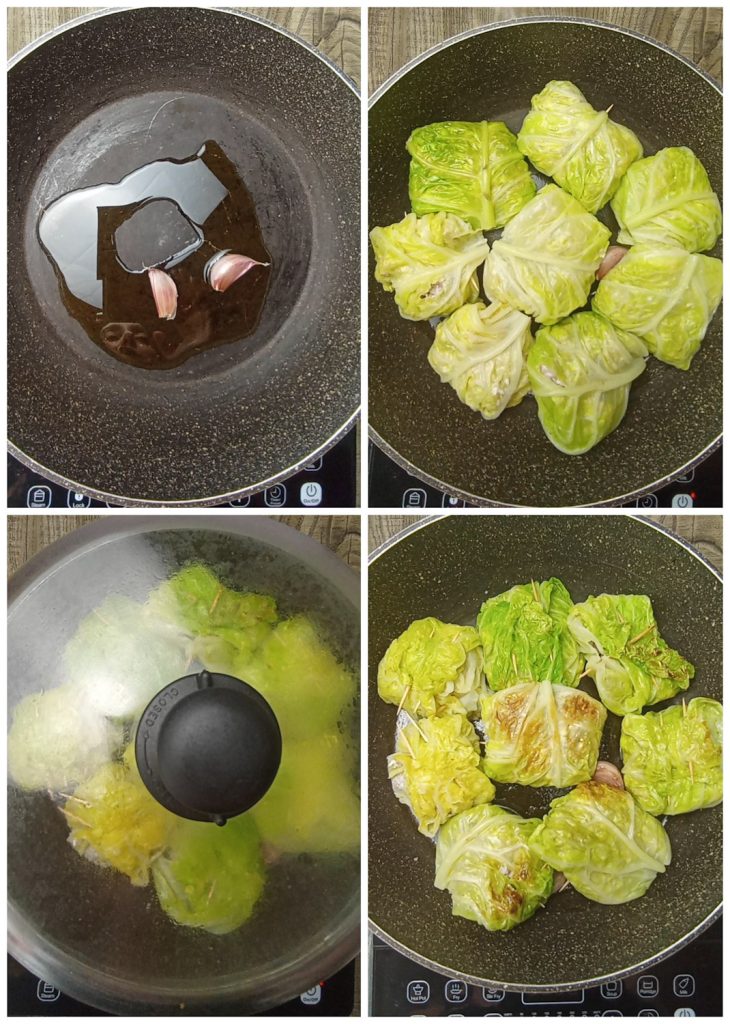 Colocamos la col en una sartén, con dos dientes de ajo, el aceite de oliva virgen extra.