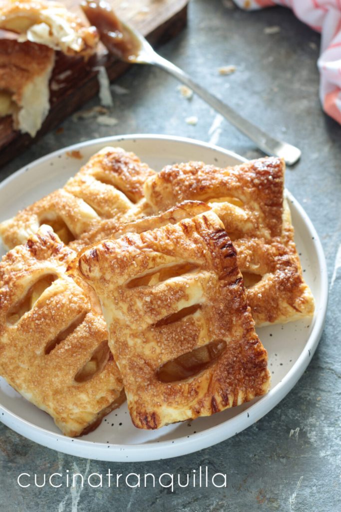 Saccottini de manzana con mermelada de castañas, divertidos, golosos, fáciles de hacer y también muy rápidos. Una idea realmente sencilla que me soluciona el desayuno en familia en poquísimo tiempo y durante al menos 3 días. Porque con esta deliciosa receta saldrán varios saccottini; luego todo depende del número de personas a las que queráis ofrecerlos. Dorados y crujientes, esta vez he decidido acompañar las deliciosas manzanas cortadas en cubitos con una mermelada de castañas muy fácil de encontrar en el comercio. Aporta a nuestro dulce ese toque extra en estas aún frías mañanas primaverales. Más abajo os dejo otras ideas sencillas para hacer con manzanas, y al final de la receta completa con paso a paso fotográfico, responderé a algunas preguntas sencillas sobre este artículo.