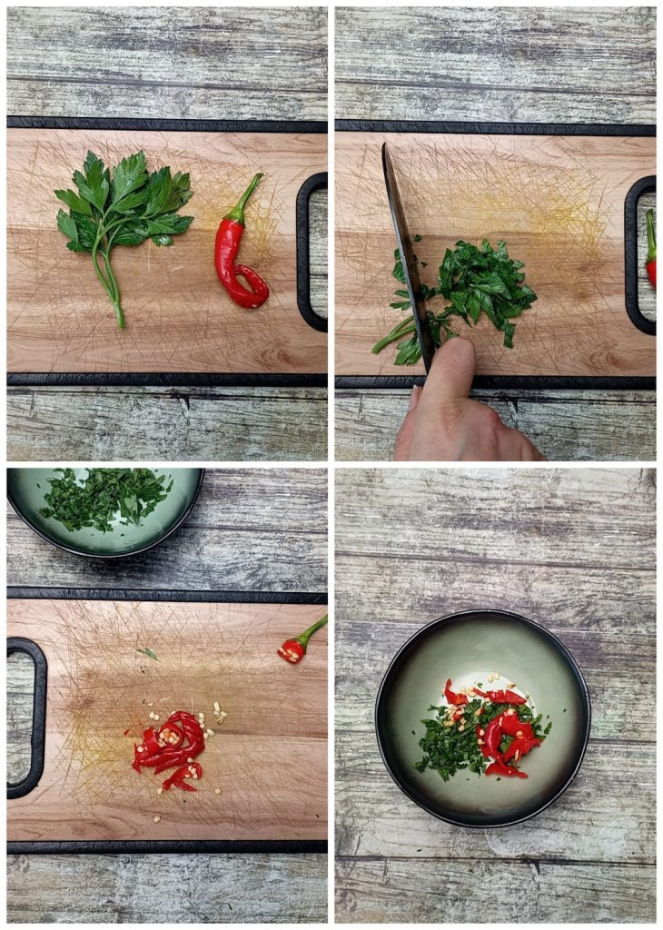 • Pica finamente el perejil fresco y corta la guindilla en rodajas.