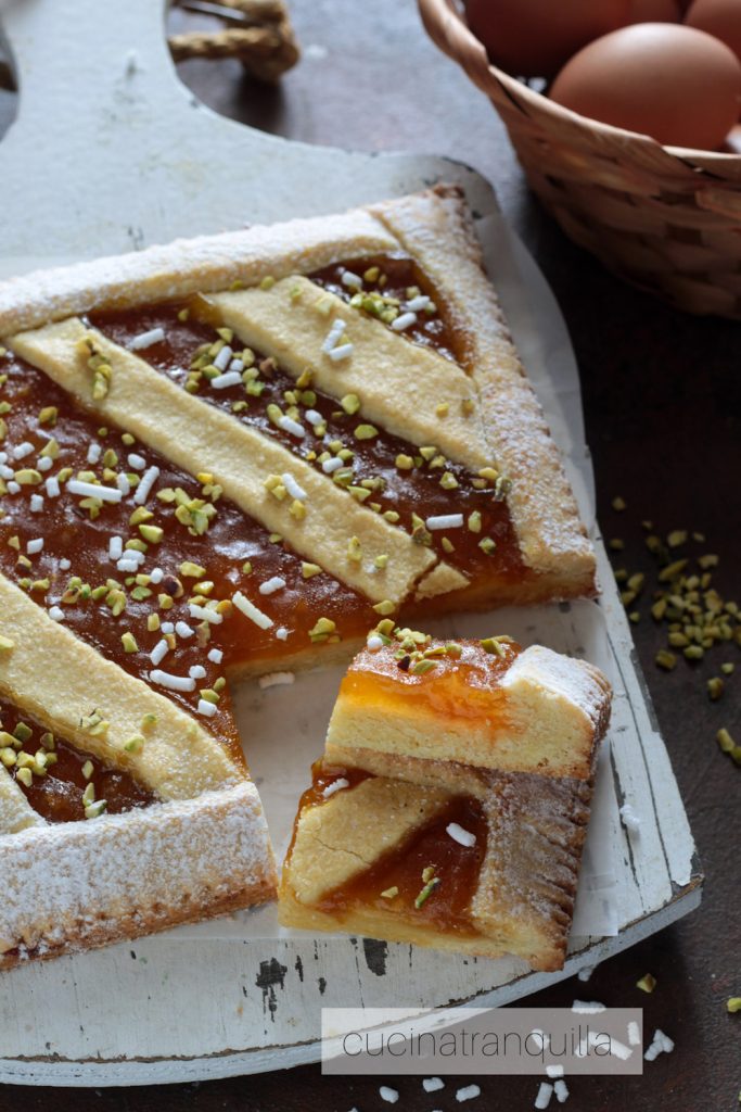 Tarta de albaricoque, deliciosa y sencilla enriquecida con granillo de pistacho y granillo de azúcar.