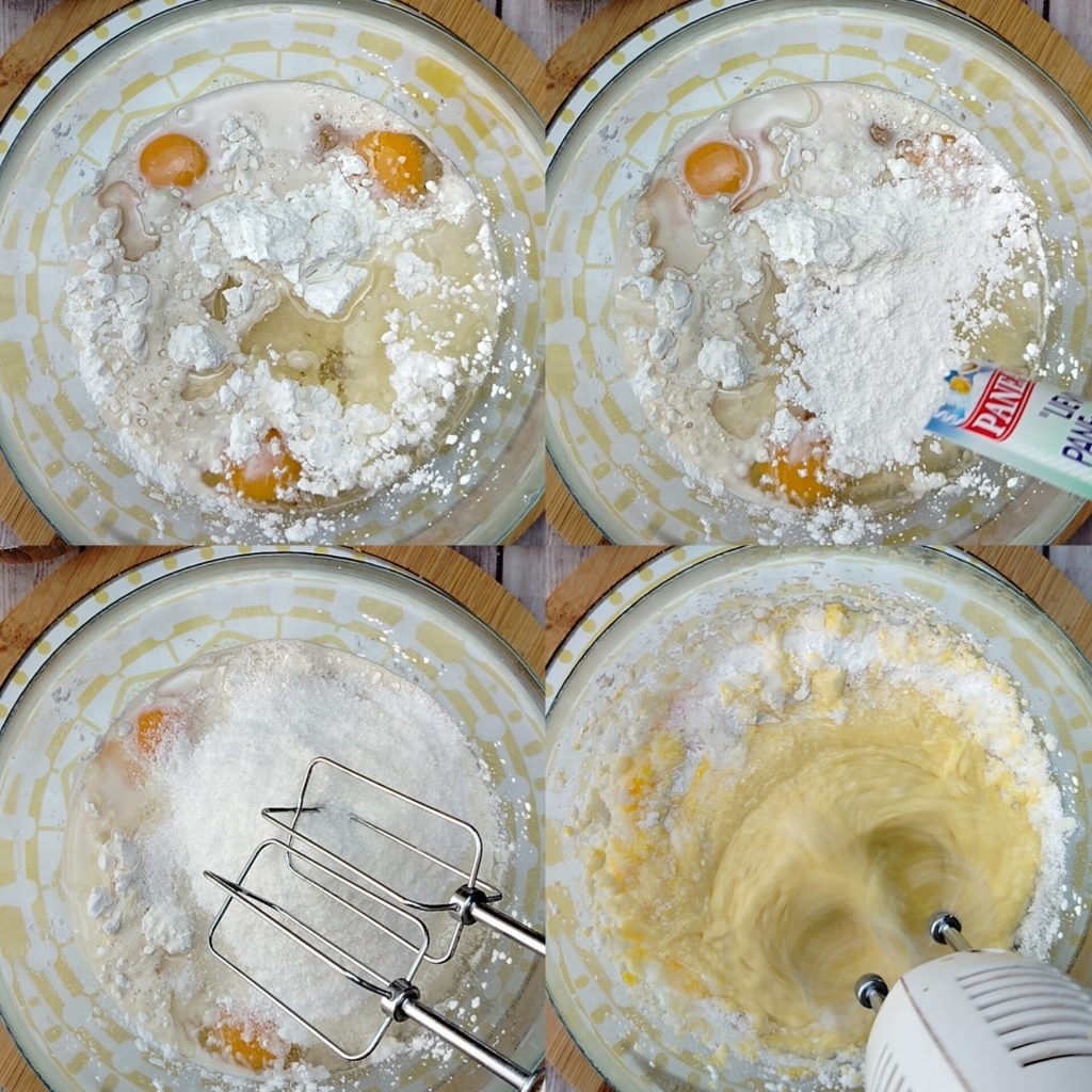 Agregad la harina de coco, una pizca de sal fina y la levadura para dulces, que podéis, como es tradición, filtrar con un colador para tamizarla. Pero en este tipo de receta lo veo como un paso adicional, no estrictamente necesario. Comenzad a mezclar bien los ingredientes con las batidoras eléctricas, trabajando la masa por al menos 5 minutos.