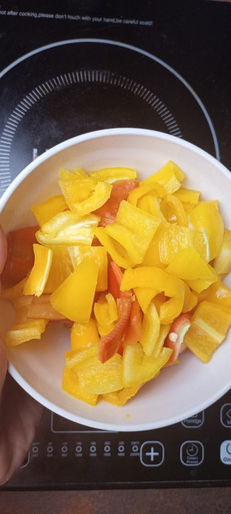 Quitamos el tallo a los pimientos, los cortamos, eliminamos las semillas y también los cortamos en cubos.