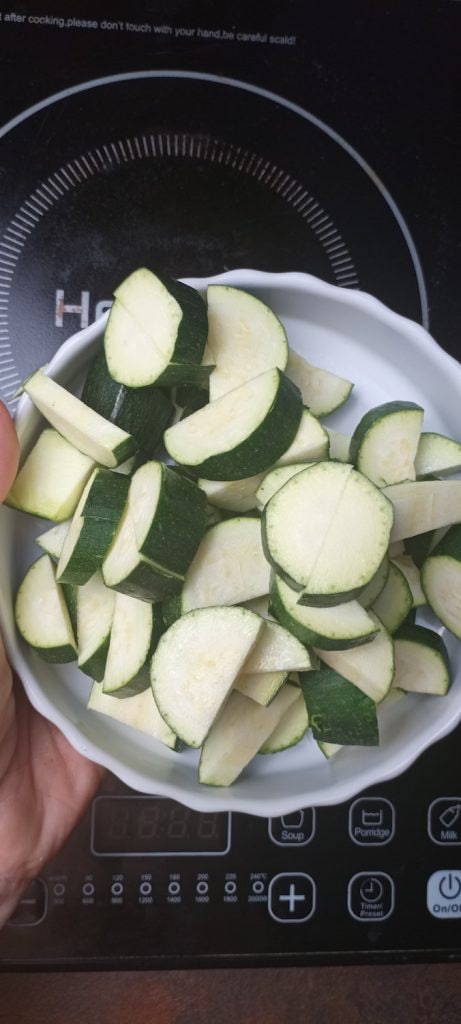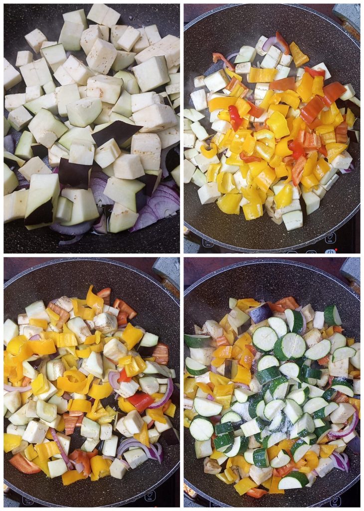 Por supuesto, presta atención a los tiempos de cocción, cada verdura tiene su tiempo. Las berenjenas cortadas en cubos necesitan un poco más de tiempo de cocción en comparación con los calabacines y los pimientos.