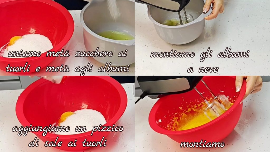 Unimos la mitad del azúcar a las yemas y la otra mitad a las claras y las montamos a punto de nieve. Añadimos una pizca de sal a las yemas y batimos.