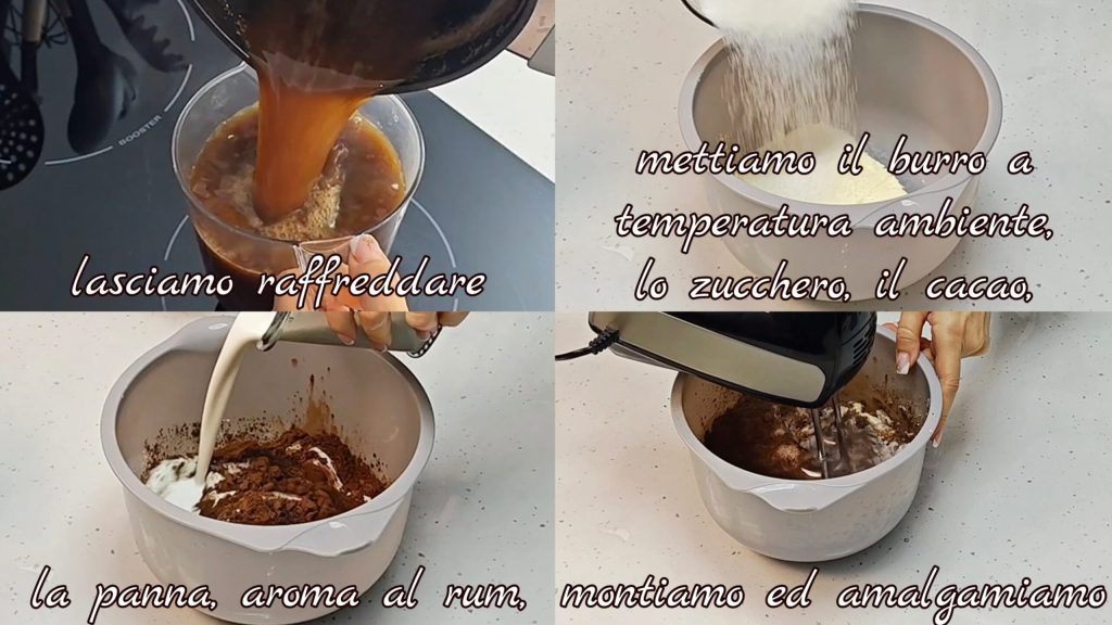 En un recipiente ponemos la mantequilla a temperatura ambiente, el azúcar, el cacao, la nata, aroma a ron y batimos y mezclamos con las varillas.