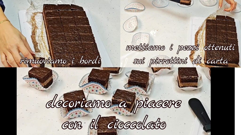 • retiramos los bordes, luego ponemos los cuadritos en las cápsulas de papel. Decoramos al gusto con el chocolate fundido.