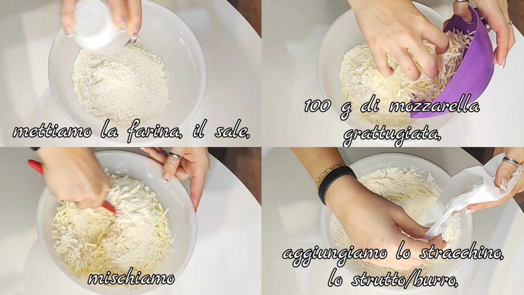 En un recipiente ponemos la harina, un poco de sal, 100 g de mozzarella rallada y mezclamos. Añadimos el stracchino, la manteca/mantequilla.