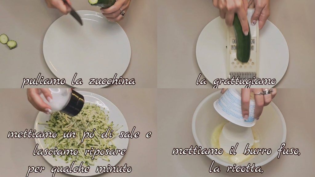 • Primero lavamos, limpiamos y rallamos el calabacín. Añadimos un poco de sal y dejamos reposar por unos minutos. En un recipiente ponemos la mantequilla derretida, la ricotta,