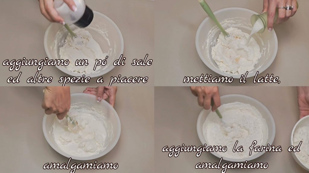 • Añadimos un poco de sal y especias al gusto. Añadimos la leche y mezclamos. Añadimos la harina y mezclamos.