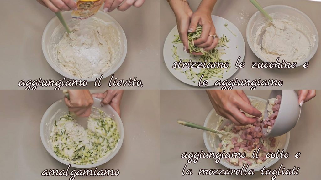 • Añadimos la levadura y mezclamos bien. Escurrimos los calabacines y los añadimos. También agregamos el jamón cocido cortado y la mozzarella, luego mezclamos.