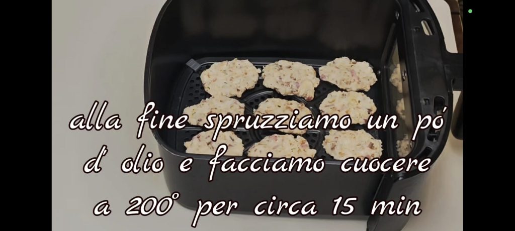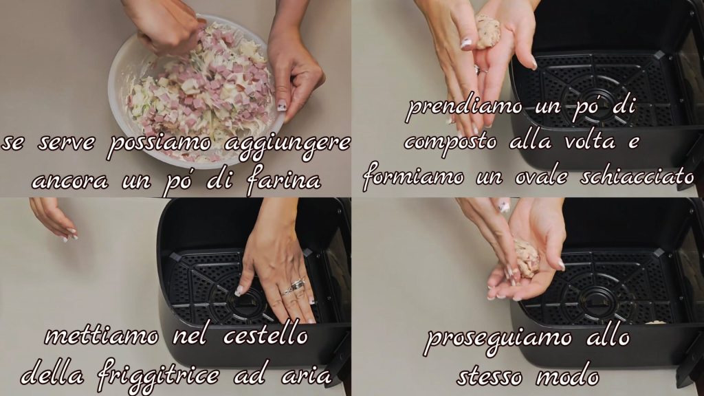 • Si es necesario, podemos añadir un poco más de harina. Tomamos un poco de la mezcla a la vez y formamos un óvalo aplastado. Lo ponemos en el cestillo de la freidora de aire y procedemos con los otros de la misma manera.