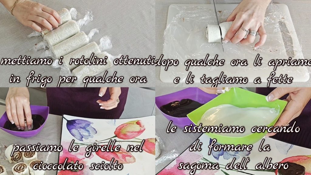 Ponemos los rollitos obtenidos en el frigorífico unas horas y luego los cortamos en rodajas un poco gruesas (yo corté cada rollo en 3 partes) para obtener los rollitos. Los pasamos por el chocolate derretido y luego los colocamos tratando de formar un árbol.