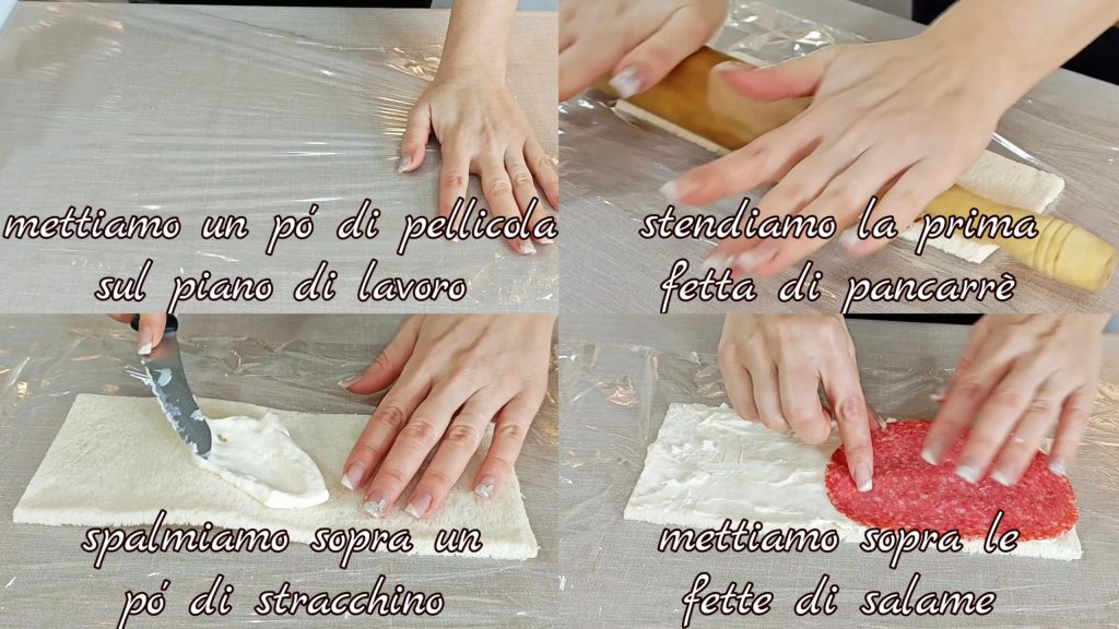 Primero ponemos el film en la superficie de trabajo y extendemos la primera rebanada de pan de molde. Ponemos encima un poco de stracchino, rodajas de salami