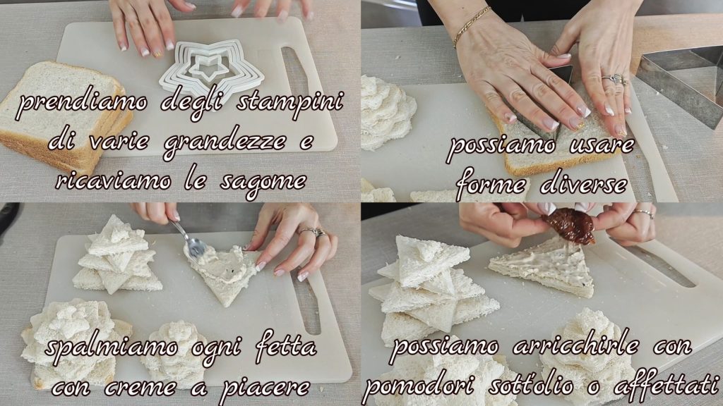 Primero tomamos moldes de diferentes tamaños y cortamos figuras del pan de molde. Obviamente podemos usar formas diferentes (estrella, triángulo, flor, círculo, cuadrado, etc). Untamos cada figura obtenida con cremas untables a placer y enriquecemos con tomatitos en aceite, embutidos, etc.