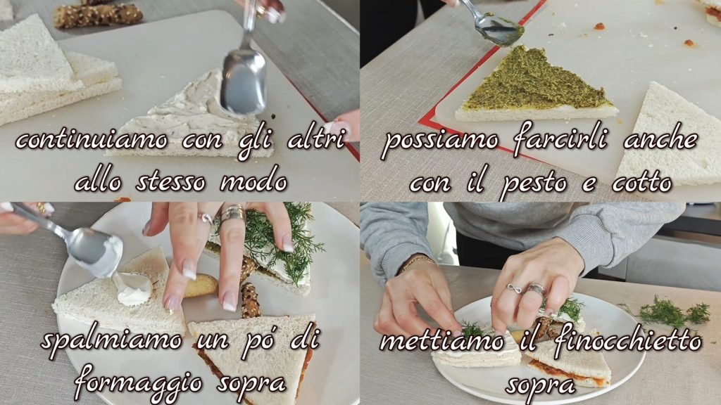 Tomamos las rebanadas de pan de molde y las cortamos para obtener triángulos. Untamos encima cremas saladas al gusto y cubrimos con otro triángulo de pan de molde. Insertamos en el centro un trozo de palito de pan para formar la base.