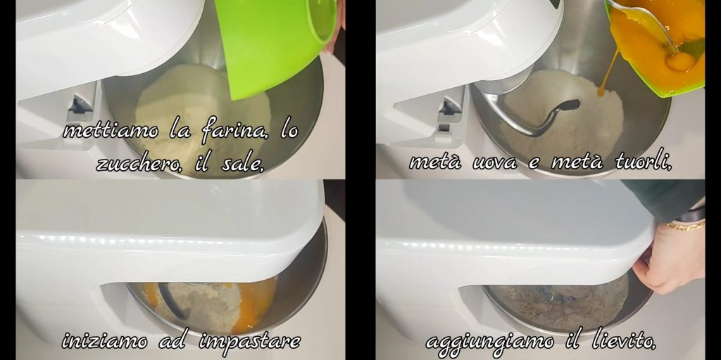 Añadimos un poco más de huevos y yemas. Amasamos hasta que la masa empiece a despegarse de las paredes, luego seguimos añadiendo poco a poco los huevos y las yemas. Al final, añadimos la mantequilla fría en trozos y amasamos nuevamente para incorporarla. Transferimos la masa obtenida a un recipiente de borde alto.