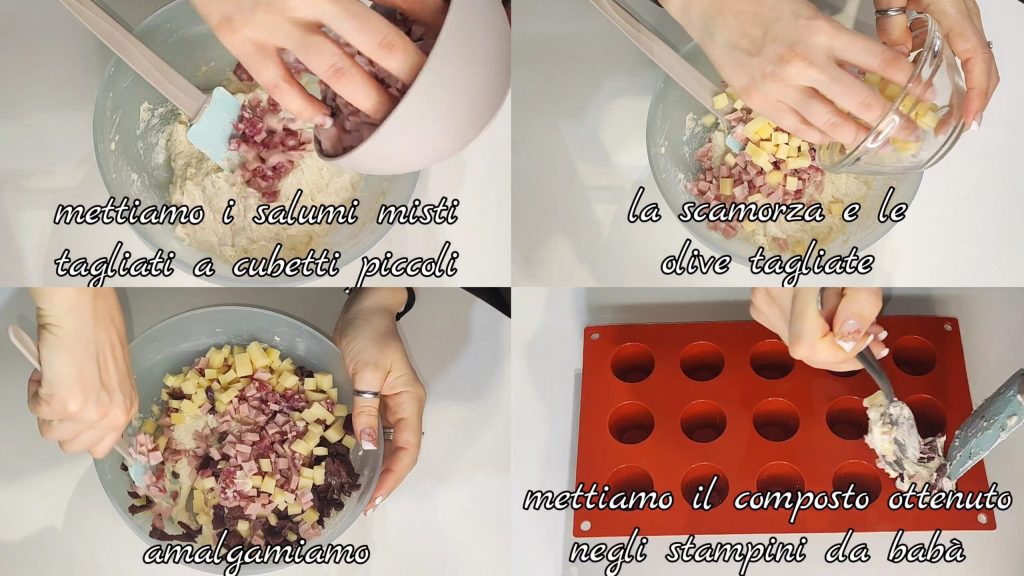 Añadimos los embutidos mixtos cortados en cubos, la scamorza cortada y las aceitunas y mezclamos bien. Ponemos la mezcla obtenida en los moldecitos para babá.