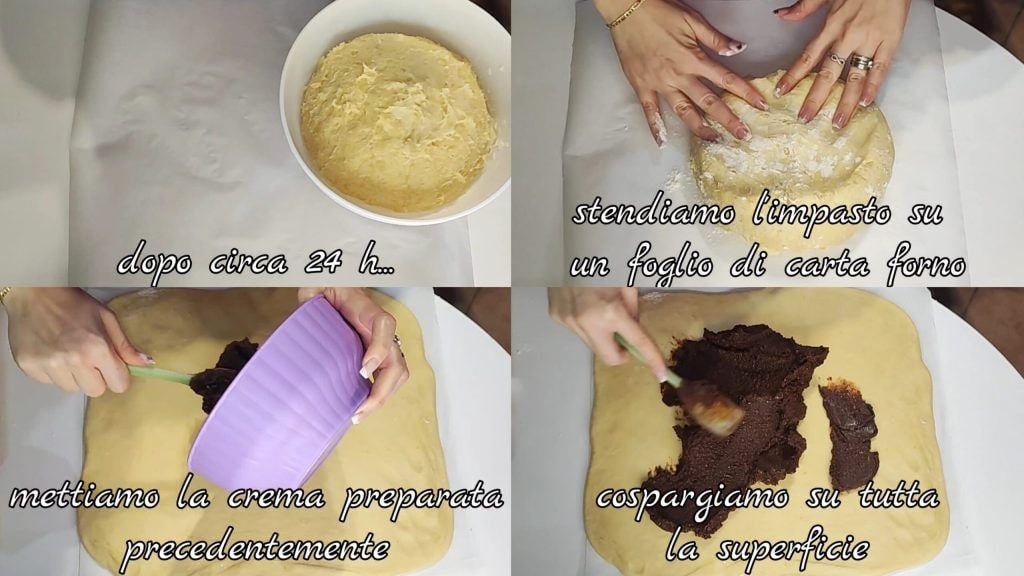 Después de unas 24 horas, sacamos la masa de la nevera y la extendemos sobre un papel de horno (más o menos hasta obtener el tamaño del papel). Ponemos el relleno obtenido encima y lo esparcimos por toda la superficie dejando un centímetro del borde vacío.