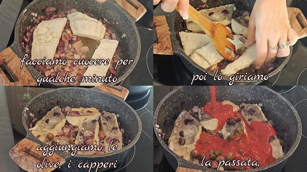 Cocinamos por unos minutos por ambos lados. Añadimos las alcaparras, las aceitunas, el puré,