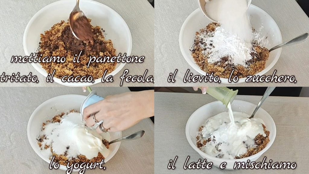 • Primero picamos finamente el panettone o el pandoro. Añadimos el cacao, la fécula, la levadura, el azúcar, el yogur, la leche y mezclamos.
