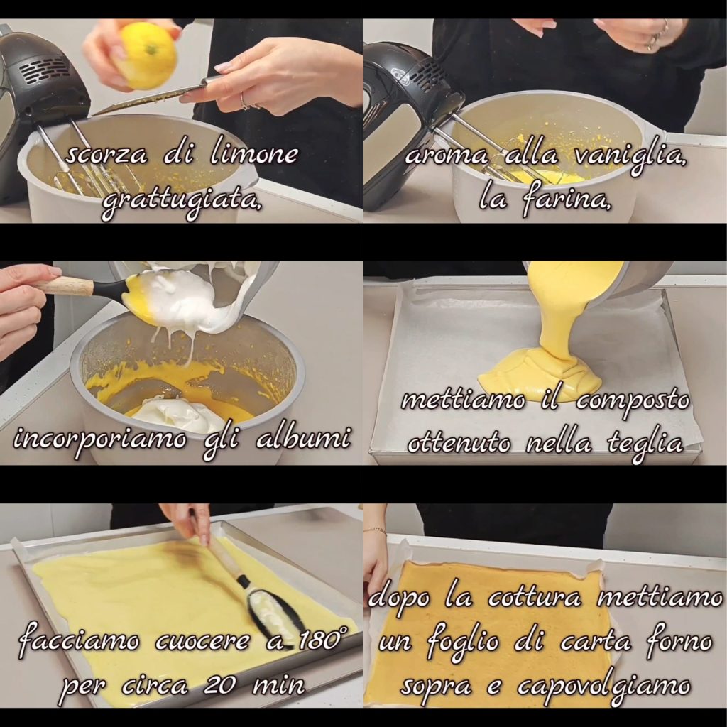 la ralladura de limón, la vainilla y la harina. Al final incorporamos delicadamente las claras montadas. Ponemos la mezcla obtenida en la bandeja, esparcimos y nivelamos y luego horneamos a 180° durante unos 20 minutos.