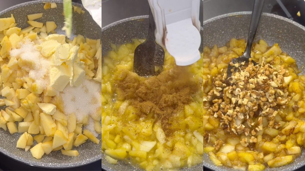 Corta las manzanas en cubos. Pon las manzanas en una sartén con el azúcar y la margarina. Cocina durante unos 10 minutos, hasta que las manzanas estén tiernas. Añade la canela, remueve y apaga el fuego. Incorpora los frutos secos picados y las pasas. Deja enfriar completamente.