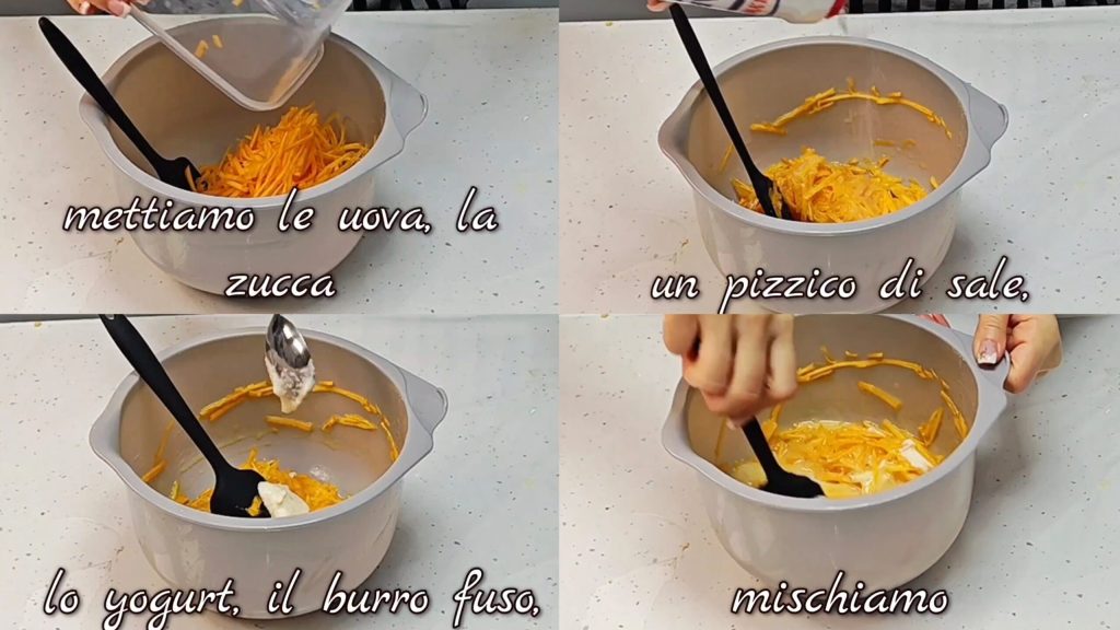 En un recipiente ponemos los huevos, la calabaza rallada, sal, el yogur, la mantequilla derretida y mezclamos.