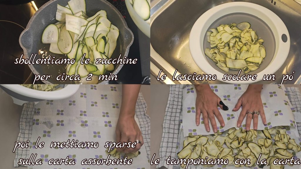 Escaldamos los calabacines durante unos 2/3 minutos, luego los dejamos escurrir durante unos minutos. Los colocamos extendidos sobre papel o un paño limpio. Los secamos con un poco de papel