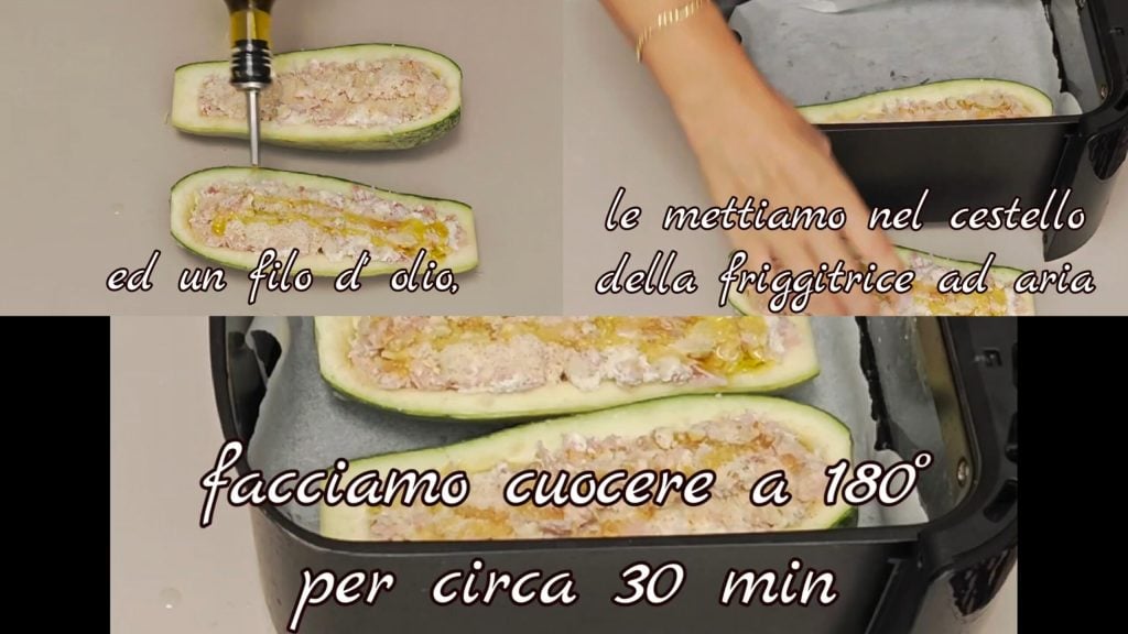 Siempre del huerto de mis amigos he recibido este calabacín gigante, ¿y cuál es la mejor manera de cocinarlo si no es relleno? 😁 Dado que ahora hago todo en freidora de aire, la he usado también para esta receta. Si no tenéis calabacines gigantes como yo, van bien también los normales 😅. ¡Un relleno hecho con ricotta fresca, jamón cocido, pan y scamorza! Una receta sencilla y rápida de preparar que podemos servir como plato único, ya que tiene un poco de todo dentro.