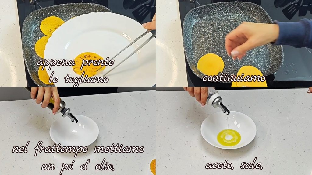 • Una vez listas, las retiramos y seguimos con las demás de la misma manera. Mientras tanto, en un recipiente ponemos un poco de aceite, vinagre, sal,