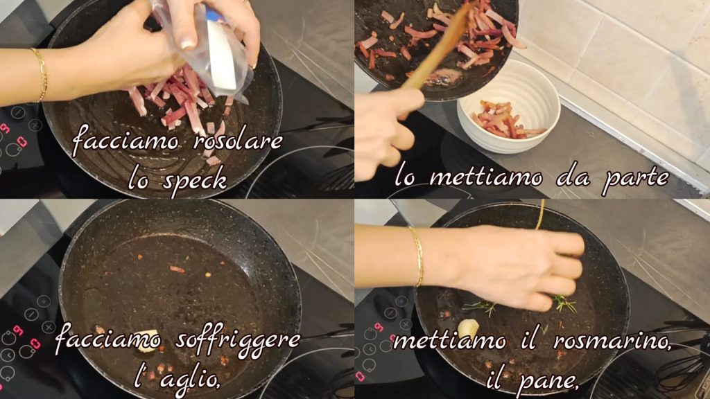 En una cacerola doramos el speck con un poco de aceite y lo apartamos. En la misma cacerola ponemos el ajo, un poco de romero, el pan cortado en cubos