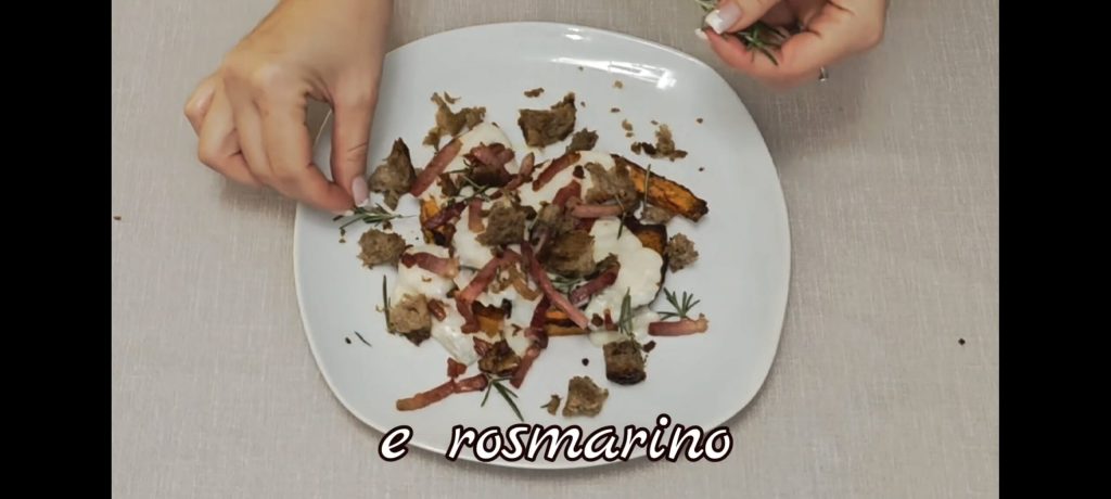 cocinamos por unos minutos. En un plato colocamos las rodajas de calabaza cocidas. Añadimos encima la salsa de queso preparada, un poco de speck, los crostini de pan