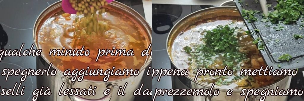 Unos minutos antes de apagarlo, añadimos los guisantes ya cocidos y el cubito de caldo. Al final, ponemos el perejil picado y apagamos.
