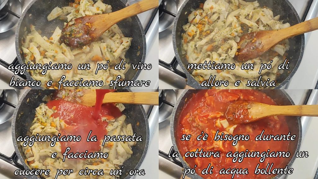 Ponemos un poco de vino blanco y dejamos que se evapore. Añadimos un poco de laurel, salvia, el tomate triturado y cocinamos durante aproximadamente una hora, removiendo de vez en cuando. Si es necesario, añadimos un poco de agua de cocción de los callos.