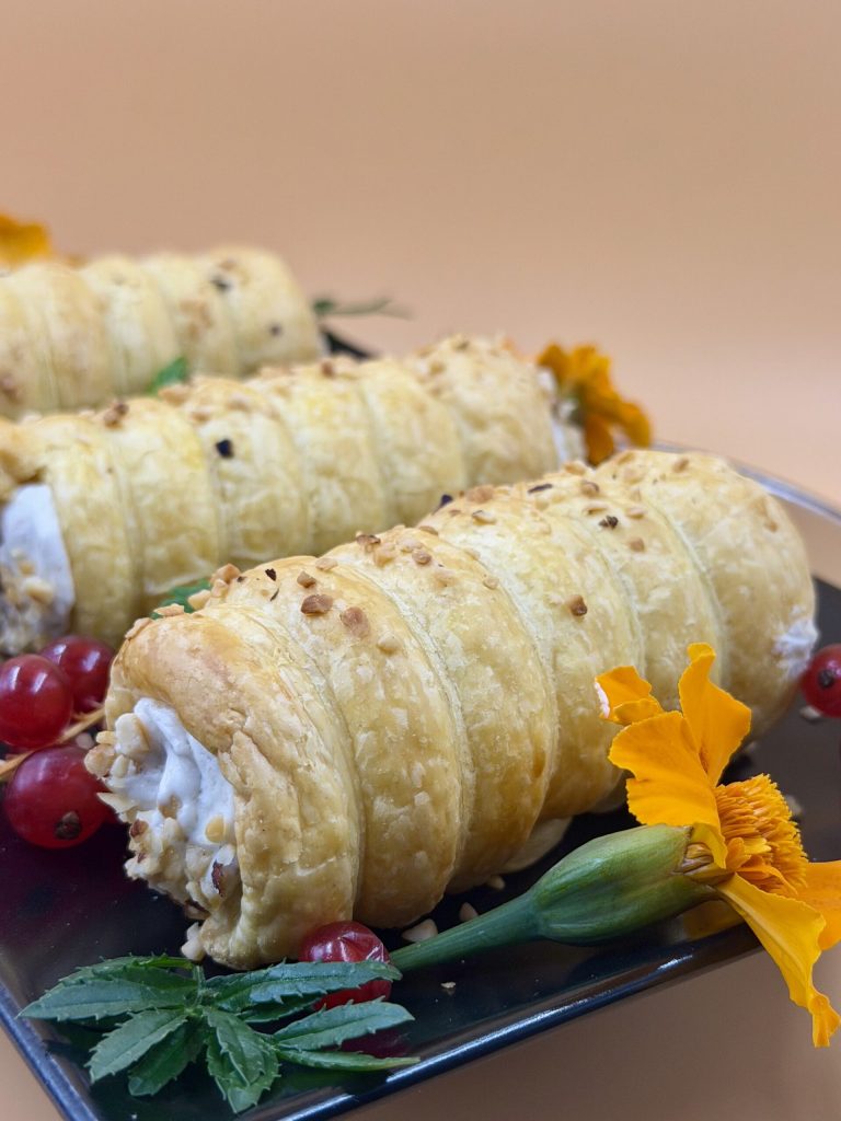 Los cannoli de hojaldre dulces con mascarpone y nueces son un postre navideño fácil y delicioso, ideal para quien quiere llevar a la mesa un dulce elegante pero sencillo de preparar. La masa hojaldre crujiente y dorada envuelve una crema suave de mascarpone, nata y nueces, con un sabor refinado e irresistible. Perfectos para servir después del almuerzo de Navidad o como dulce de fiestas, estos cannoli dulces de hojaldre conquistarán a todos con su ligereza y el delicado aroma de vainilla