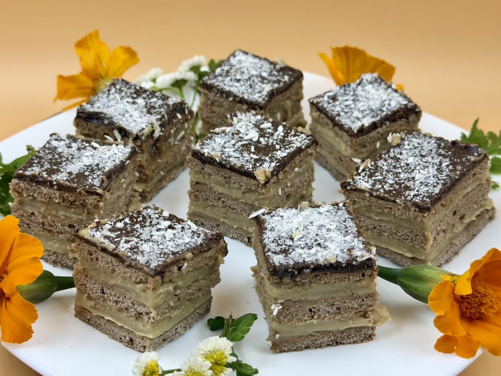 espolvorea con coco rallado. Deja que se enfríe en la nevera otros 30 minutos, luego recorta los bordes y corta en porciones del tamaño deseado.