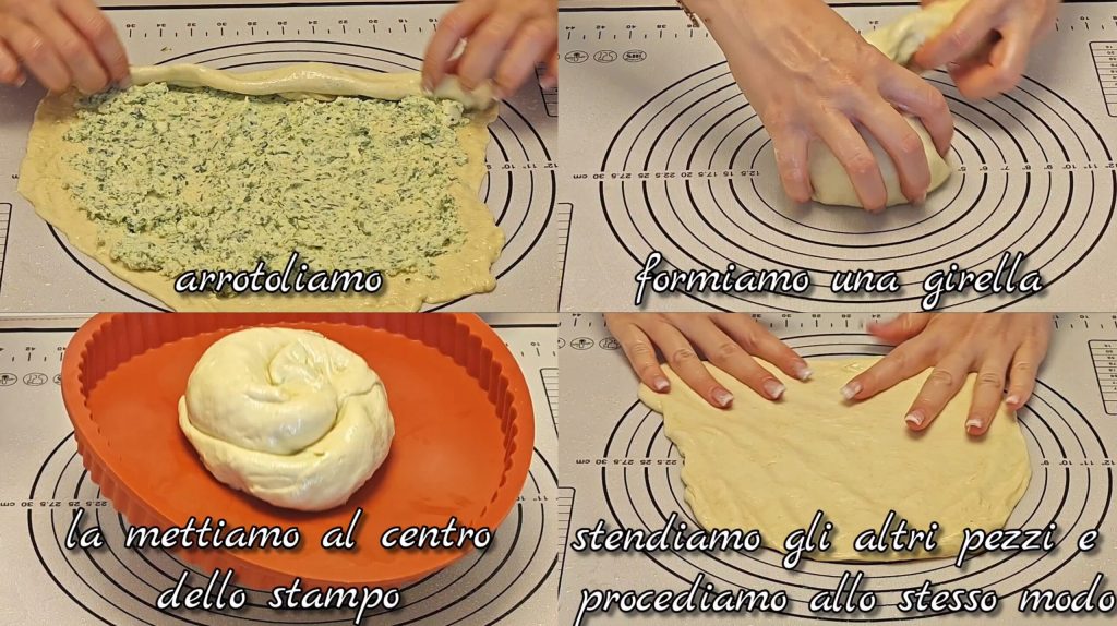 Enrollamos formando una caracola y la colocamos en el centro del molde forrado con papel para horno. Procedemos igual con los otros trozos