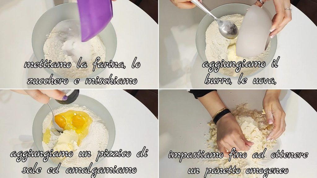 En un recipiente ponemos la harina, el azúcar y mezclamos. Añadimos la mantequilla, los huevos, una pizca de sal, amalgamamos y amasamos hasta obtener una masa homogénea.