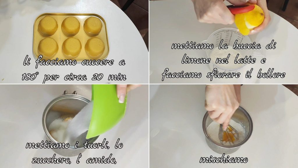 Ponemos la piel de limón en la leche y llevamos casi a ebullición. En un cazo ponemos las yemas, el azúcar, la fécula y mezclamos.
