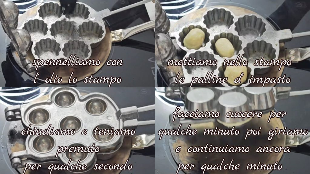 Pintamos con aceite el molde y colocamos las bolitas de masa. Cerramos bien y mantenemos presionado durante unos minutos luego giramos y cocinamos por unos minutos más.