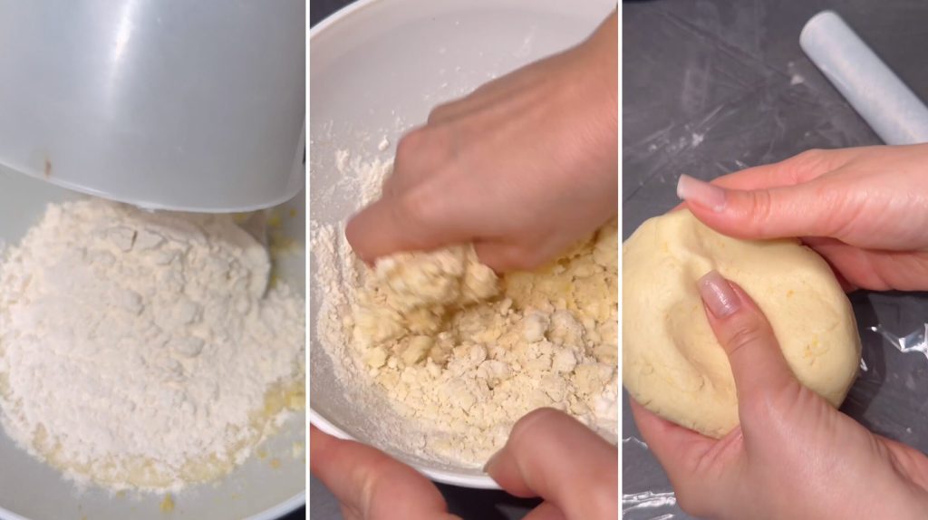 luego añadimos la harina y amasamos rápidamente hasta obtener una masa lisa. Formamos una bola