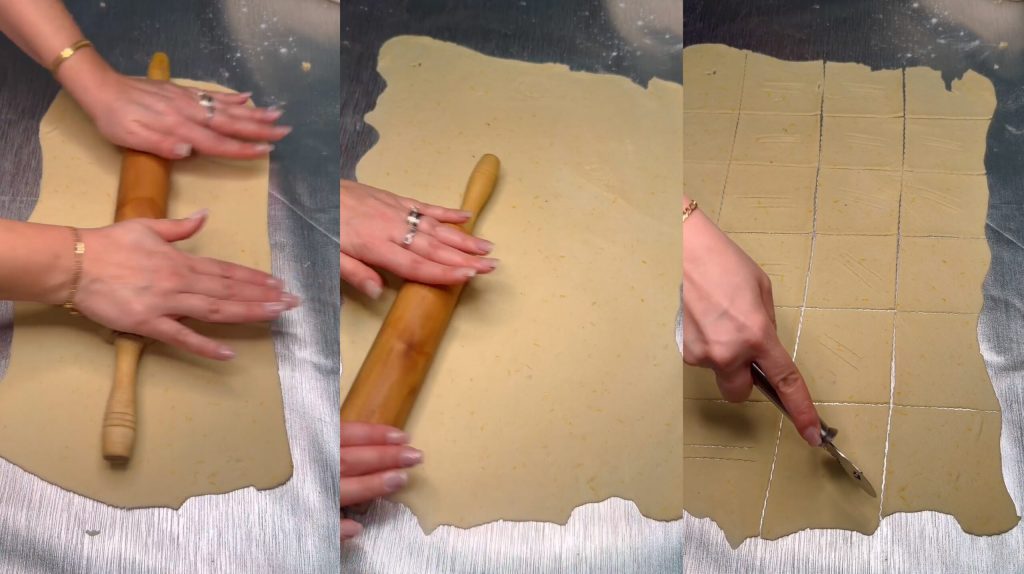 Después de unos pliegues, extendemos la masa lo más fina posible. Cortamos en piezas del tamaño deseado y hacemos las dos clásicas incisiones centrales.