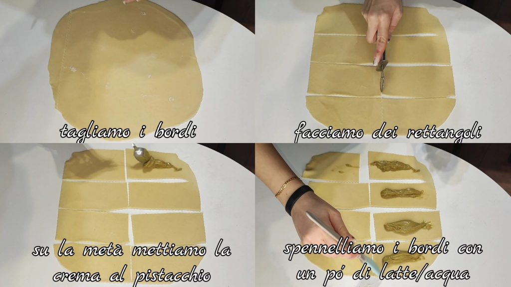 Cortamos los bordes y luego cortamos rectángulos. En la mitad ponemos un poco de crema de pistacho. Pincelamos los bordes con un poco de leche/agua.