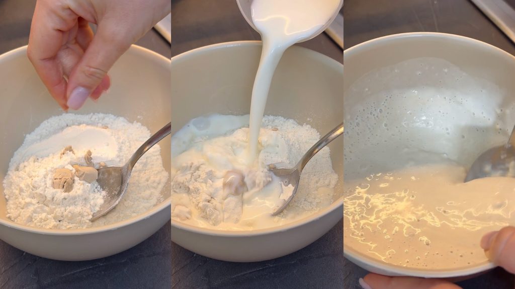 • Cuando el prefermento está listo añado la harina restante, el azúcar, la levadura restante y el prefermento preparado.
