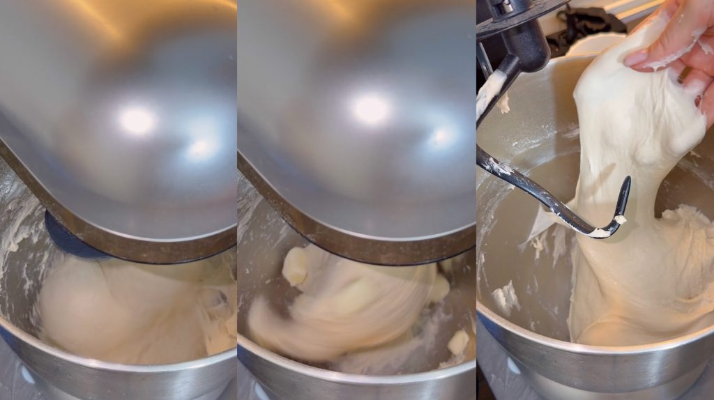 Sigo amasando hasta que la mantequilla se incorpore completamente en la masa.
