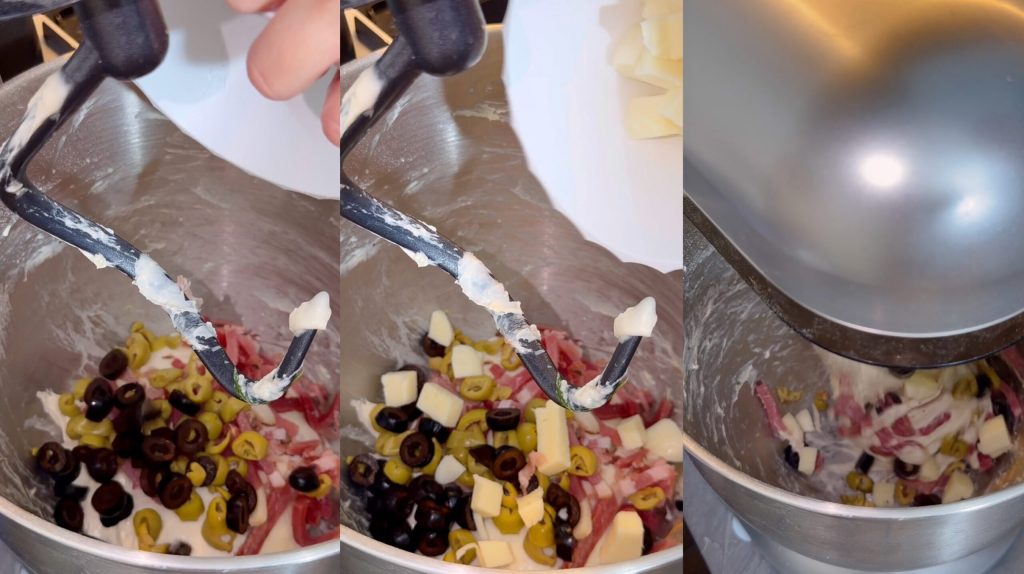 Cuando la masa está lista añado el speck, las aceitunas y la scamorza.