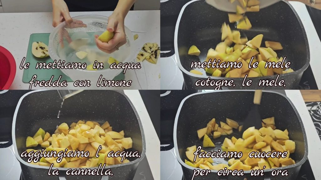 Ponlos en agua fría con limón. En una cacerola, pon las manzanas, los membrillos, el agua, la canela y cocina durante aproximadamente 1 hora.