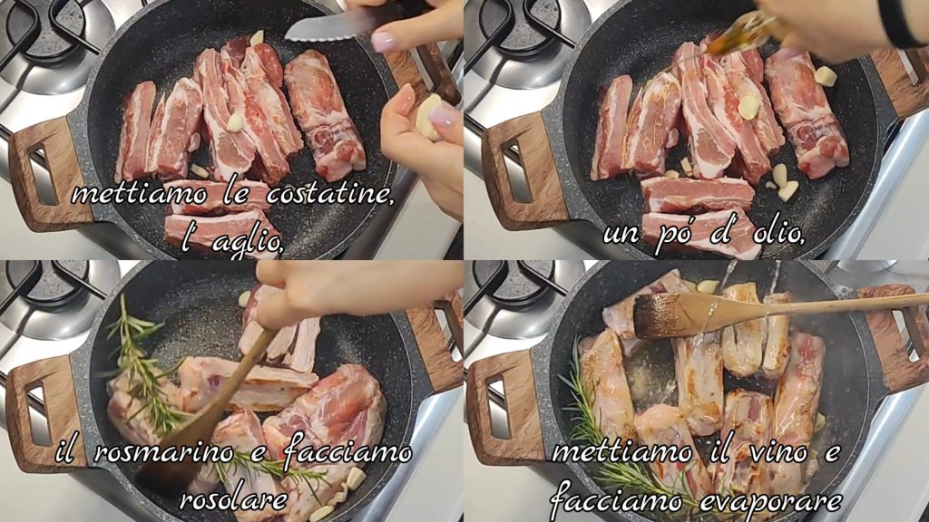 En una cacerola ponemos las costillas, un poco de ajo en trozos y un poco de aceite, una ramita de romero y dejamos dorar por unos minutos. Añadimos el vino blanco y dejamos evaporar.