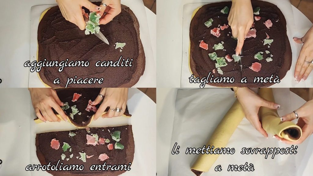 Añadimos frutas confitadas a gusto. Cortamos por la mitad y enrollamos ambas partes para obtener dos rollos. Los ponemos uno sobre otro a la mitad.